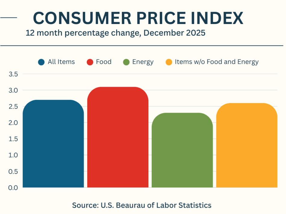 The latest Consumer Price Index (CPI) report underscores this growing gap. In December, inflation rose 0.3% month over month, bringing the annual rate to 2.7%, well above the Federal Reserve’s 2% target. Food prices remain a significant driver of financial strain. Prices for food at home and at restaurants each increased 0.7% in just one month. Over the past year, grocery prices rose 2.4%, while food away from home climbed 4.1%.